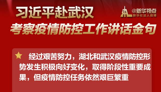 在抗击新冠肺炎疫情的关键时刻,中共中央总书记、国家主席、中央军委主席习近平10日专门赴湖北省武汉市考察疫情防控工作。他强调,湖北和武汉是这次疫情防控斗争的重中之重和决胜之地。